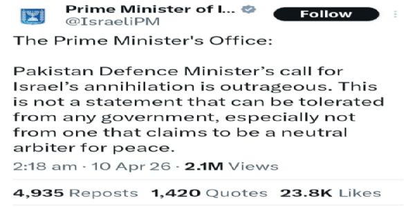 તેલ અવીવ, નવી દિલ્હી, 10 એપ્રિલ (હિ.સ.). શનિવારે ઇસ્લામાબાદમાં અમેરિકા અને ઈરાન વચ્ચે પ્રસ્તાવિત બેઠક પહેલા ઇઝરાયલ અને પાકિસ્તાને એકબીજા સામે તીવ્ર પ્રતિક્રિયા આપી છે. અમેરિકા અને ઈરાન વચ્ચે મધ્યસ્થી તરીકે કામ કરી રહેલા પાકિસ્તાનના સંરક્ષણ પ્રધાનની