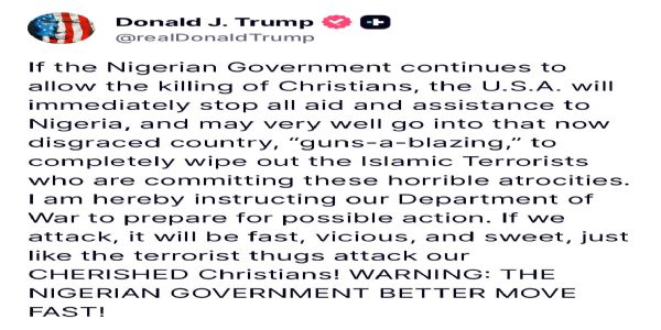 વોશિંગ્ટન, 2 નવેમ્બર (હિ.સ.) : યુએસ રાષ્ટ્રપતિ ડોનાલ્ડ ટ્રમ્પનો નાઇજીરીયા સરકાર સામે ગુસ્સો સતત વધી રહ્યો છે. ટ્રમ્પે નાઇજીરીયાને ખુલ્લી ધમકી આપી હતી, જેમાં કહ્યું હતું કે તેઓ યુએસ યુદ્ધ વિભાગને કાર્યવાહી માટે તૈયાર રહેવાનો નિર્દેશ આપી રહ્યા છે. બ